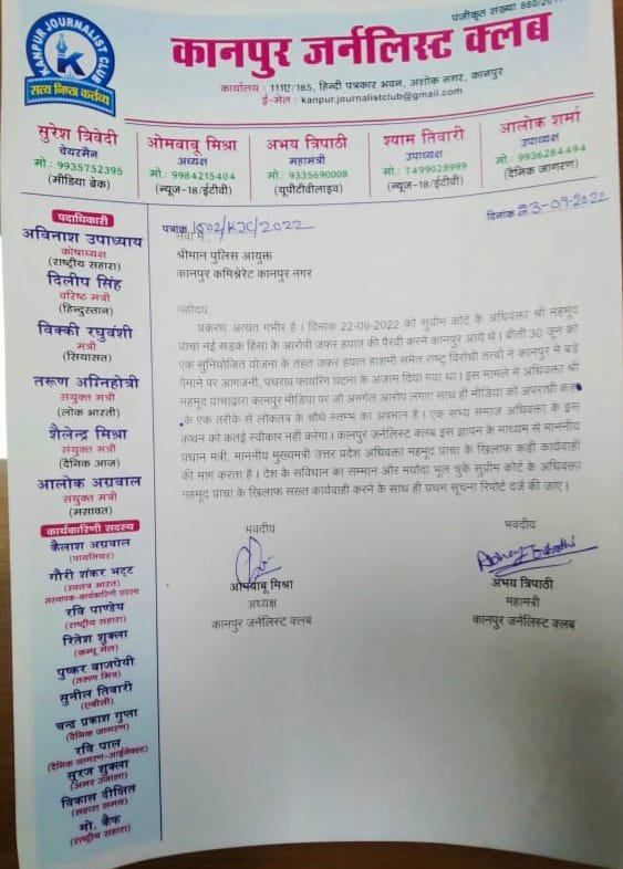 कानपुर (रीजनल एक्सप्रेस)। कानपुर में 3 जून को हुई संप्रदायिक हिंसा के मुख्य आरोपी हयात जफर हाशमी की पैरवी करने कानपुर आए सुप्रीम कोर्ट के अधिवक्ता महबूब प्राचा ने गुरुवार को कानपुर की मीडिया पर अनर्गल आरोप लगाते हुए मीडिया को अपराधी तक कह डाला था, जो कि संविधान की किसी भी परिभाषा में सही नहीं है। शुक्रवार को कानपुर जर्नलिस्ट क्लब का एक प्रतिनिधिमंडल पुलिस आयुक्त बी. पी. जोगदण्ड से मिलकर मुख्यमंत्री को संबोधित ज्ञापन सौपा और महबूब प्राचा के खिलाफ कड़ी कार्यवाही की मांग की।