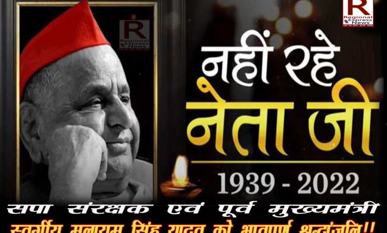 लखनऊ (रीजनल एक्सप्रेस)। समाजवादी पार्टी के संस्‍थापक और तीन बार उत्‍तर प्रदेश के मुख्‍यमंत्री रहे मुलायम सिंह यादव नहीं रहे।  नेताजी को यूरिन संक्रमण, ब्‍लड प्रेशर की दिक्‍कत और सांस लेने में तकलीफ की वजह से दो अक्‍टूबर को मेदांता अस्‍पताल में भर्ती कराया गया था। तभी से उनकी हालत नाजुक बनी हुई थी। उनके कई अंगों ने काम करना बंद कर दिया था। नौ दिन तक मेदांता के आईसीयू और क्रिटिकल केयर यूनिट (सीसीयू) में जिंदगी और मौत के बीच जूझते रहने के बाद नेताजी ने सोमवार सुबह 8:16  बजे अंतिम सांस ली। 82 साल की उम्र में सोमवार सुबह उनका निधन हो गया।
