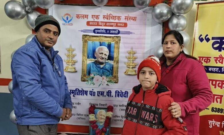 कानपुर (रीजनल एक्सप्रेस)। समाज सेवी एवं ज्योतिषाचार्य पंडित एमo पीo त्रिवेदी की प्रथम पुण्यतिथि पर कलम एक स्वैच्छिक संस्था के द्वारा गुरुकुल इंटरनेशनल स्कूल गंगागंज पनकी में जरूरत मंद लोगों को कंबल एवं बच्चों को शिक्षण सामग्री एवं चाकलेट वितरित की गई। पंडित त्रिवेदी सेना से सेवानिवृत्त के उपरांत बैंक में सेवा दिया।