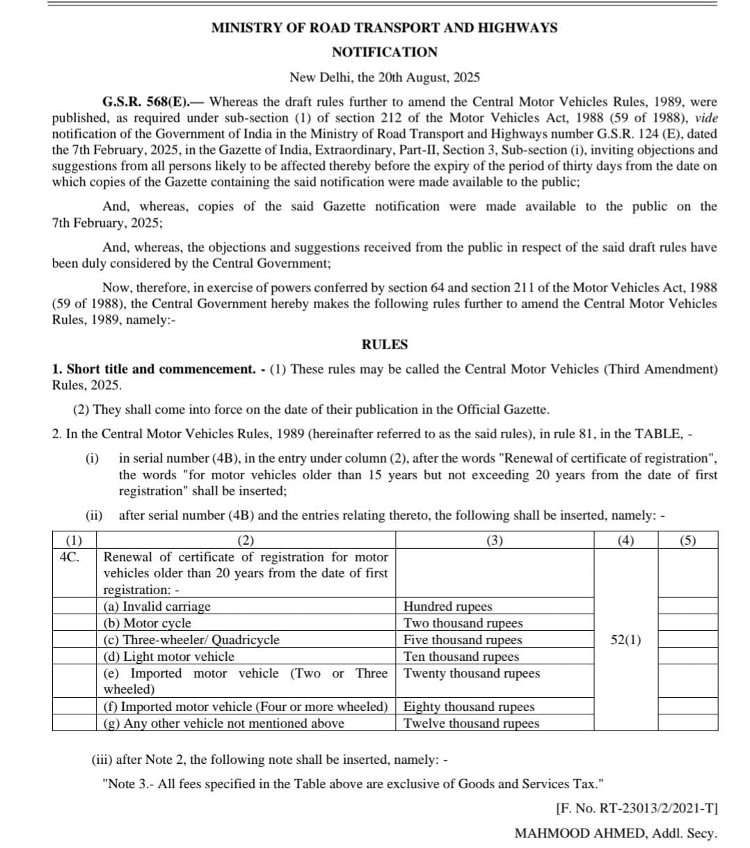 “सेंट्रल मोटर व्हीकल्स रूल्स (तीसरा संशोधन), 2025” के तहत 20 अगस्त, 2025 से पूरे देश में लागू हो चुका है!