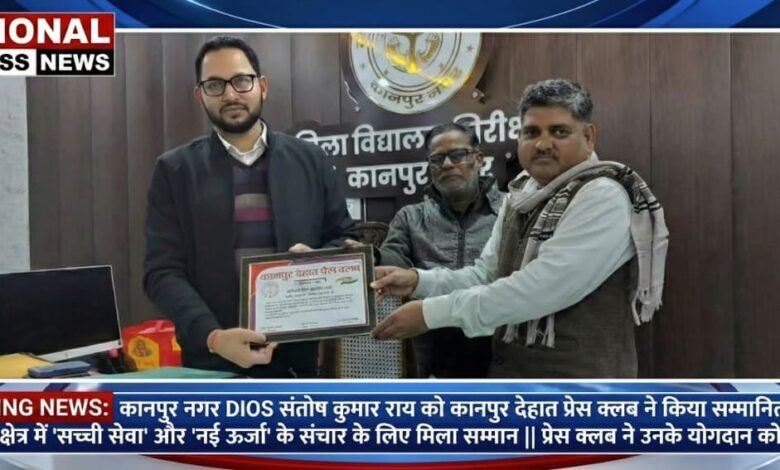 कानपुर(रीजनल एक्सप्रेस)। शिक्षा के क्षेत्र में उत्कृष्ट योगदान और समाज के प्रति अपनी जिम्मेदारियों का बखूबी निर्वहन करने के लिए कानपुर नगर के जिला विद्यालय निरीक्षक (DIOS), संतोष कुमार राय को गुरुवार को एक गरिमामयी माहौल में सम्मानित किया गया। यह विशेष सम्मान उन्हें कानपुर देहात प्रेस क्लब की टीम द्वारा उनके कार्यालय में प्रदान किया गया।